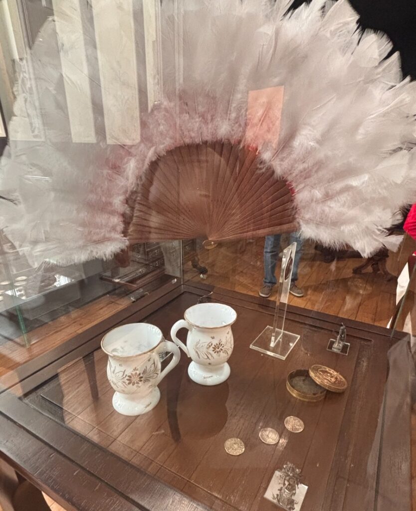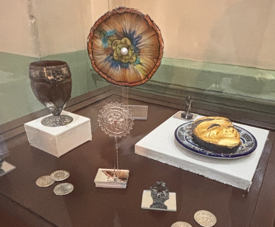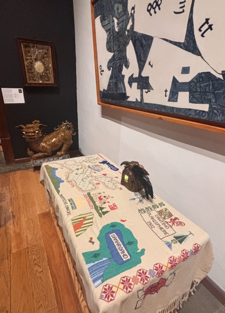 Pero entonces hace unos días me encuentro durante mi visita, que muchas obras que habían estado exhibidas en los primeros dos niveles del edificio -arte plumaria del siglo XVII, un plano de la ciudad del siglo XVII, algunos objetos de plata novohispana, pinturas y objetos litúrgicos- no se encontraban en su sitio original. Las encontré en el tercer nivel del edificio, exhibidas en la muestra temporal “De lo Bello a lo invisible” en donde estas obras antiguas conviven con expresiones contemporáneas del artista Francisco Guevara. El impacto fue enorme: objetos de plumas, monedas, biombos pintados con formas abstractas en el 2024, textiles, pinturas y objetos modernos conviviendo con una cera de agnus del siglo XVIII, objetos litúrgicos del periodo novohispano, con talavera histórica de los siglos XVII y XVIII, con bargueños taraceados en marfil de los siglos XVIII y XIX ….